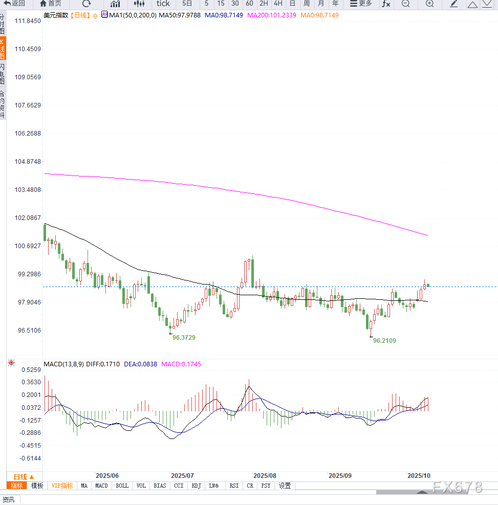 这一政策预期加剧了美元的短期承压。分析师指出,美元短期下行压力主要源于政府停摆及市场对美联储降息预期的反应,若经济数据或鲍威尔讲话偏鹰派,美元可能出现技术性反弹。美元指数日线图显示,DXY自上月高点回落至99关口下方,目前短期均线呈向下排列,MACD在零轴下方延伸,RSI接近45水平,显示短线偏空动能占优。